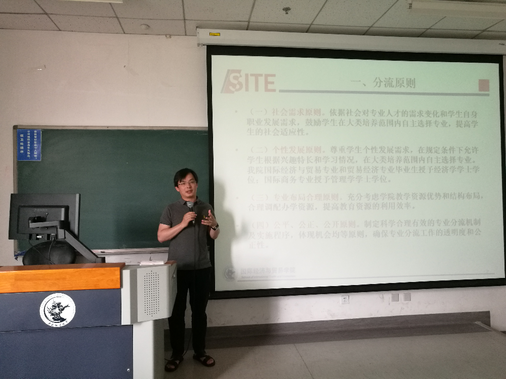 6月20日上午,yl9193永利官网在沙河校区主教210教室举行了2018级大类招生学生专业分流宣讲会,对学生开展了专业分流动员和说明。yl9193永利官网副院长符大海副教授,院党委副书记李瑞琴教授,国际贸易系系主任张艳副教授、国际商务系系主任霍达副教授、贸易经济系纪珽老师及其他相关老师出席宣讲会,会议由符大海副院长主持,2018级经济与贸易类全体本科生参加了会议。