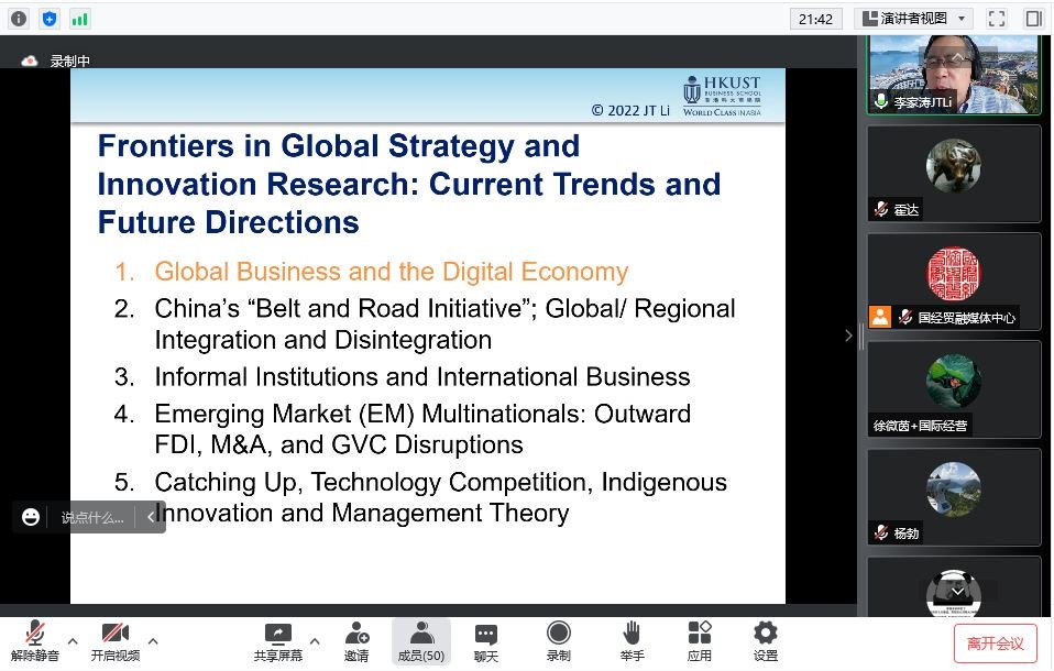 讲座结束后李家涛教授同与会师生进行了广泛交流,回答了数字经济新形势下生态优势理论拓展、客户需求变化与企业营销策略等问题,就数字经济实证研究路径与数据库建设等问题与师生进行了探讨,为师生在数字经济领域开展国际商务问题研究提供了宝贵建议。