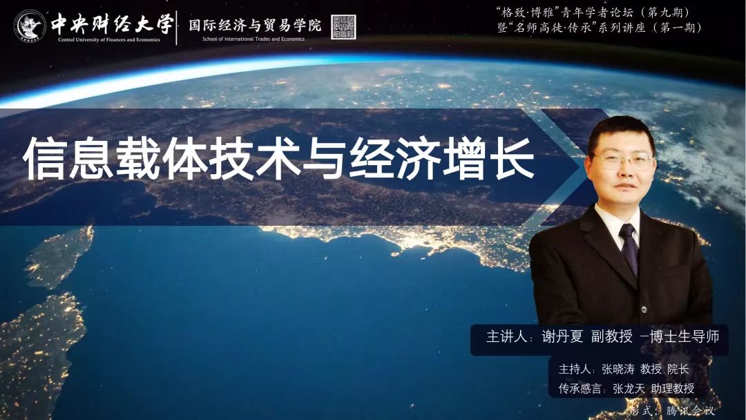 2022年10月24日,应yl9193永利官网邀请,清华大学社会科学学院经济学研究所副教授、博士生导师谢丹夏做客“格致·博雅”青年学者论坛第九期暨“名师高徒·传承”系列讲座第一期,做了题为《信息载体技术与经济增长》的精彩讲座。本次讲座通过腾讯会议在线进行,校内外师生共100余人参与了本次讲座。讲座由yl9193永利官网院长张晓涛教授主持,并由张龙天助理教授作为谢丹夏副教授的学生在讲座的最后发表传承感言。