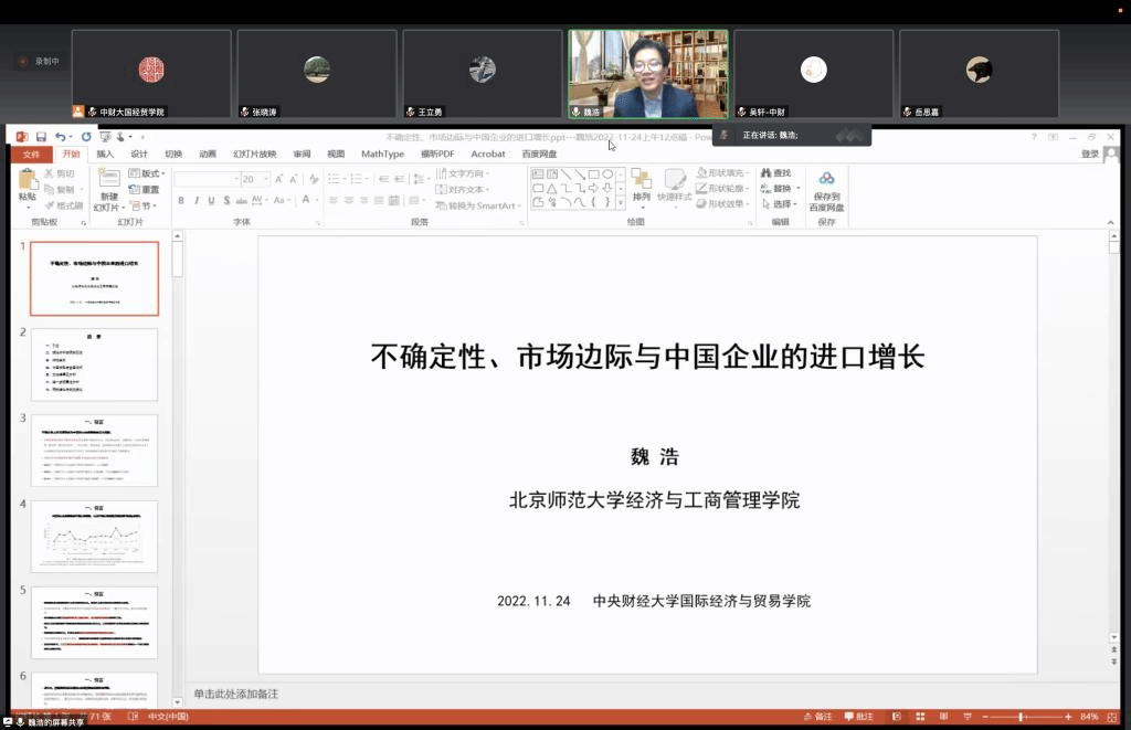 2022年11月24日下午16:00-17:30,yl9193永利官网通过腾讯会议举办了“格致·博雅”青年学者论坛(第十期),北京师范大学经济与工商管理学院魏浩教授为师生做了题为《不确定性、市场边际与中国企业进口》的精彩报告。本次论坛由yl9193永利官网副院长王立勇教授主持,校内外师生120余人参会。
